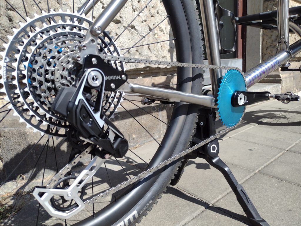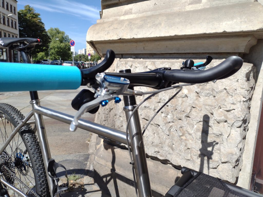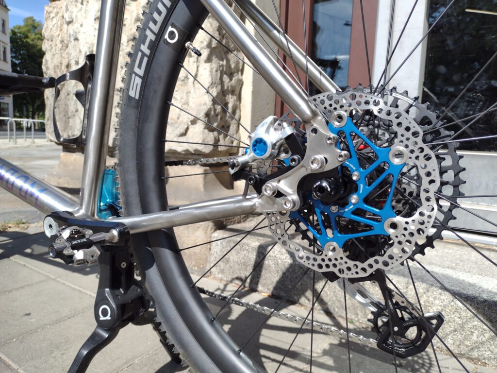 Das Omnium Titanium ist mit der SRAM XX Eagle AXS Transmission 12-fach Funkschaltung aufgebaut. Mit einer Bandbreite von 520% ist das Lastenrad ebenso berggängig, als auch in der Ebene schnell. Die Hope Scheibenbremsen haben an den Kontaktstellen innenverlegte Stahlflexleitungen. Laufräder, Cockpit, Rack und Sattelstütze sind aus Carbon gefertigt.