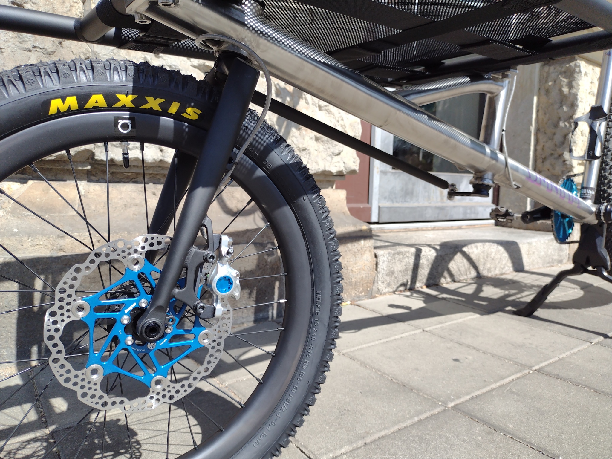 Das Omnium Titanium ist mit der SRAM XX Eagle AXS Transmission 12-fach Funkschaltung aufgebaut. Mit einer Bandbreite von 520% ist das Lastenrad ebenso berggängig, als auch in der Ebene schnell. Die Hope Scheibenbremsen haben an den Kontaktstellen innenverlegte Stahlflexleitungen. Laufräder, Cockpit, Rack und Sattelstütze sind aus Carbon gefertigt.